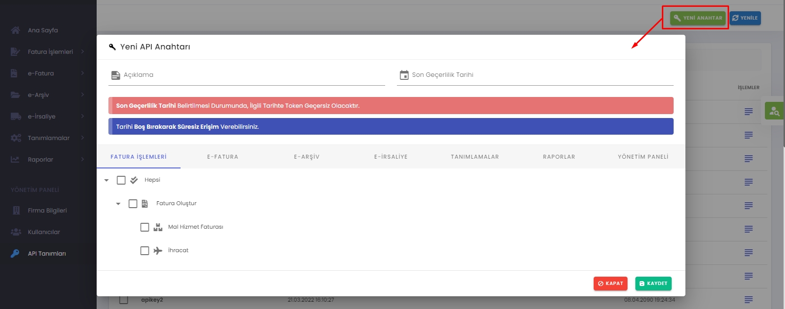 Click on API Definitions > New Key from the left menu. Fill in the information on the appeared screen.